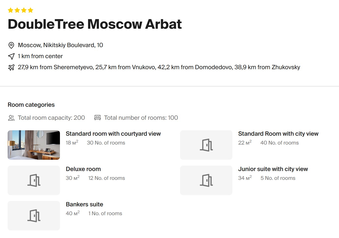 DoubleTree by Hilton Moscow Arbat มีห้องพักให้เลือกถึง 100 ห้อง ในหลากหลายประเภท ทุกห้องมาพร้อมเตียง Sweet Dream? แบบออร์โธพีดิก ตามมาตรฐาน Hilton พร้อมผ้านวมและหมอนนุ่มสบาย เพื่อการพักผ่อนอย่างแท้จริง สิ่งอำนวยความสะดวกภายในห้องครบครัน ทั้ง Wi-Fi ฟรี, ทีวีจอใหญ่ 55 นิ้ว, พอร์ต USB สำหรับชาร์จอุปกรณ์, น้ำดื่มฟรี, รวมถึงชุดชงชาและกาแฟ