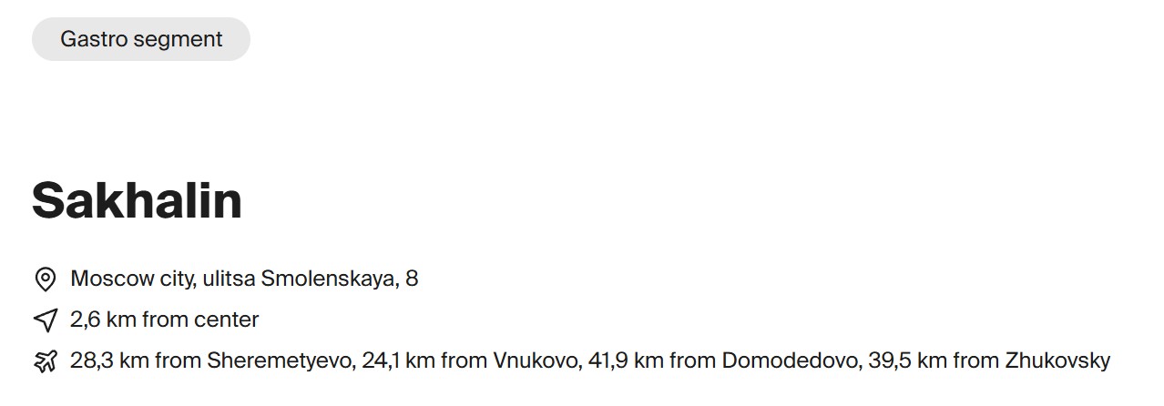 Sakhalin Restaurant คือโปรเจกต์ร้านอาหารระดับสูงของนักธุรกิจด้านอาหารชื่อดัง บอริส ซาร์คอฟ (Boris Zarkov) ร่วมกับ วลาดิเมียร์ มูคิน (Vladimir Mukhin) เชฟแบรนด์ของ White Rabbit Family