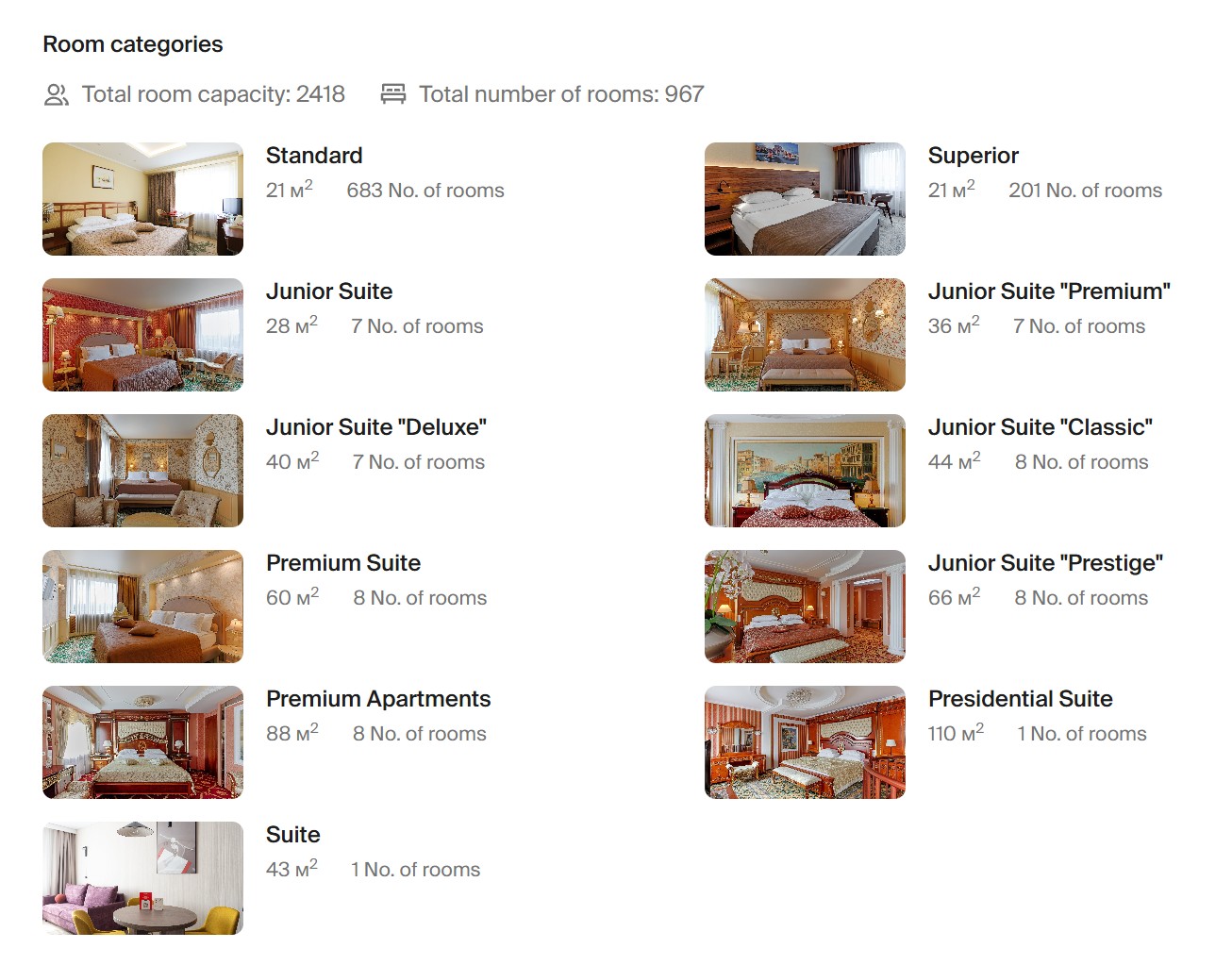 โครงสร้างพื้นฐานของโรงแรมได้รับการพัฒนาอย่างครบครัน ภายในมี ศูนย์ประชุมอเนกประสงค์ ที่ประกอบด้วยห้องประชุม 10 ห้อง, ห้องอาหาร 5 แห่ง, ล็อบบี้บาร์, ห้องจัดเลี้ยง 3 ห้อง, ไนต์คลับ รวมถึงคอมเพล็กซ์อาบน้ำชื่อดัง “Rimskie Termy” และสิ่งอำนวยความสะดวกอื่น ๆ อีกมากมาย